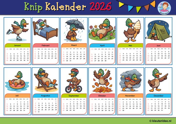 Vrolijk kleuterkalender. De kinderen kunnen op de lege bovenkant zelf een tekening of plakwerkje maken. Printen op stevig papier A3-formaat.