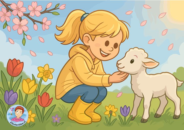 Samen met haar ontdekken de kleuters wat er allemaal verandert in de natuur: bloemen die bloeien, bijen die zoemen, lammetjes die springen en bloesem die door de lucht dwarrelt. De afbeelding kun je onder het voorlezen op het digibord laten zien.